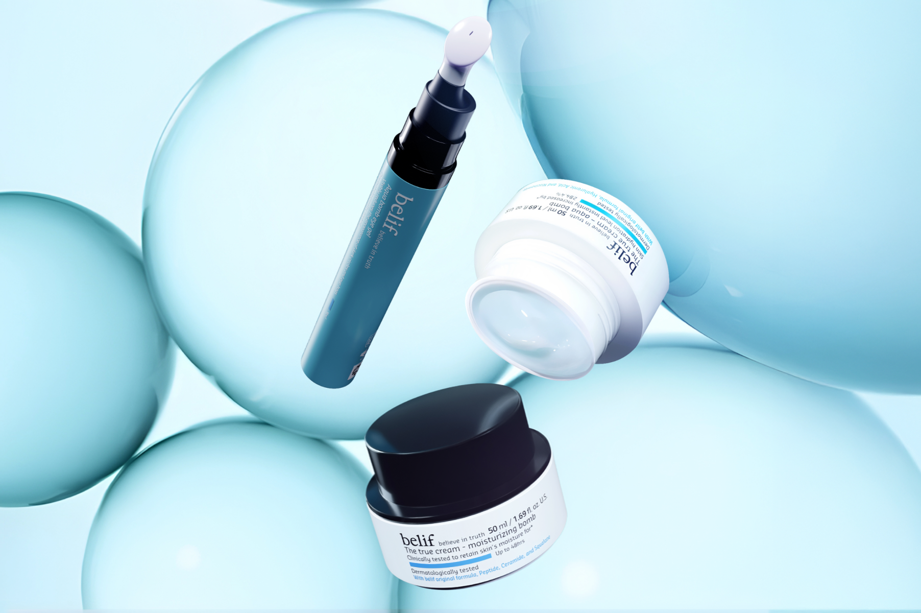 The true cream - Aqua bomb Ultra-Lightweight gel-cream that delivers instant hydration ( 10 layers of deep hydration in 10 seconds ) , refreshing, suitable for oily or combination skin and layering under makeup.